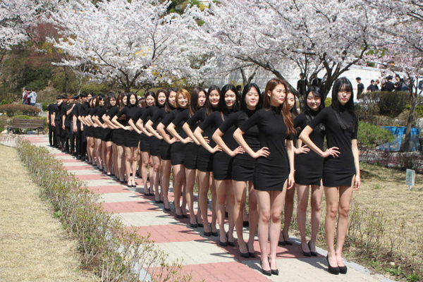 Ngày 5/4 vừa rồi, tại trường ĐH Daebuk ở thành phố Daejeon, Hàn Quốc, các sinh viên đang theo học chuyên ngành trình diễn thời trang đã được tổ chức học catwalk ở ngoài trời, ngay trong khuôn viên thơ mộng với những tán hoa anh đào nở rộ. Tất cả sinh viên đều mặc trang phục màu đen, đặc biệt là các nữ sinh ai cũng mặc váy body để khoe được vóc dáng nuột nà của mình.