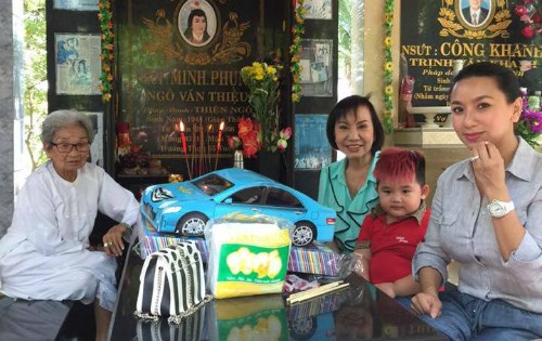 Y Phụng (ngoài cùng, bên phải) cùng gia đ́nh đi tảo mộ cha trong tiết Thanh Minh.