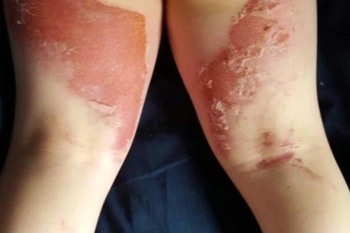 Hình ảnh chụp lại ở chân và mông cậu bé cho thấy vết bỏng to, đỏ và sưng phồng nhiều chỗ. Một số khu vực da còn đóng vảy.