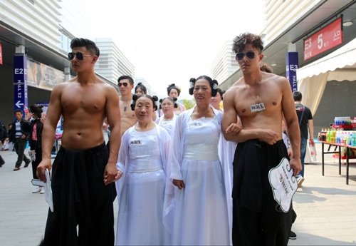 Một triển lãm ở Bắc Kinh, Trung Quốc đã gây cho người xem cảm giác chẳng giống ai. Hình ảnh những chàng "soái ca" 6 múi khoác tay thân mật với dàn các mẹ U60 gây chú ý. Nghịch cảnh trông đến lạ, hay là họ cố tình làm kiểu độc, lạ?