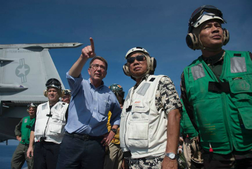 Bộ trưởng Quốc phòng Mỹ Ash Carter (trái) cùng người đồng nhiệm Philippines Voltaire Gazmin thăm tàu Stennis trên Biển Đông. Ảnh: AFP