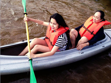 Tăng Thanh Hà đưa mẹ đi chơi, bơi thuyền.