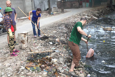 Ngày 15.5, trên Facebook thành viên có nickname M.T, xuất hiện bài đăng ghi lại cảnh nhiều người nước ngoài lội xuống cống thải đen ngòm để dọn sạch rác, đoạn cuối ngõ 381/55/4 Nguyễn Khang (nối sang Thành Thái), quận Cầu Giấy, TP.Hà Nội.
