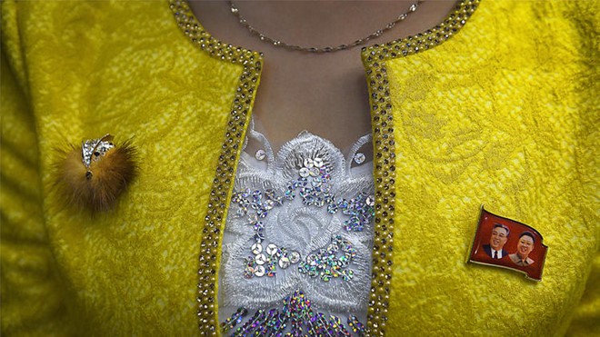Phụ nữ Triều Tiên ăn vận sang trọng và sáng màu hơn. Điểm để nhận ra họ là phù hiệu in hình 2 nhà lãnh đạo Kim Il Sung và Kim Jong Il. Ảnh: WP