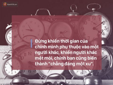 Người khác đi lấy nước, bạn cũng đi theo, mà không biết là vì buổi chiều người ta ra ngoài chơi nên mới gội đầu. Người khác đi siêu thị, bạn cũng đi theo, mà không biết người ta là vì chuẩn bị bánh mì để sáng mai ăn. Người khác đi xem phim, bạn cũng đi theo, mà không biết đó là chuyện mà người ta đã mong đợi từ lâu. Người khác làm gì cũng có kế hoạch của họ, còn bạn chỉ đang cố gắng để có thể trở thành "bạn tốt" của người ta. Khiến thời gian của chính mình phụ thuộc vào một người khác, khiến người khác mệt mỏi, chính bạn cũng biến thành "chẳng đáng một xu".