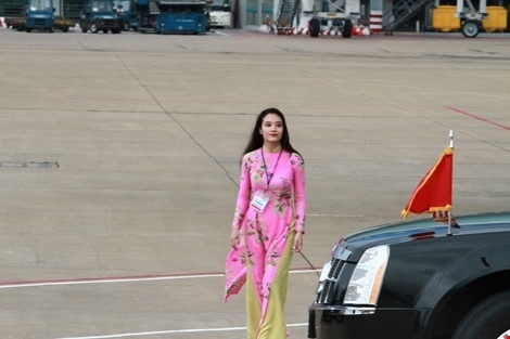 Ngay sau khi đặt chân xuống sân bay, Tổng thống Obama nhận được một bó hoa tươi thắm của một cô gái duyên dáng và xinh đẹp trong trang phục áo dài truyền thống.