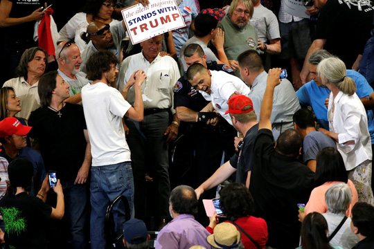 Trong lúc ông Trump đang phát biểu tại một trung tâm hội nghị, hàng trăm người biểu tình xuất hiện tìm cách phá hỏng sự kiện. Họ xô đổ rào chắn, ném chai lọ vào cảnh sát nhưng không có ai bị bắt.