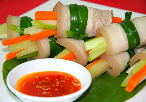 - Để miếng thịt ba chỉ ra đĩa, bên trên xếp vài cọng dưa leo, cà rốt, rau quế, cuộn tròn lại. Bạn có thể dùng tăm để ghim cố định.