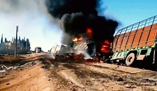 Đoàn xe vận tải của IS bị quân đội Syria không kích phá hủy. (Ảnh: Fars News)