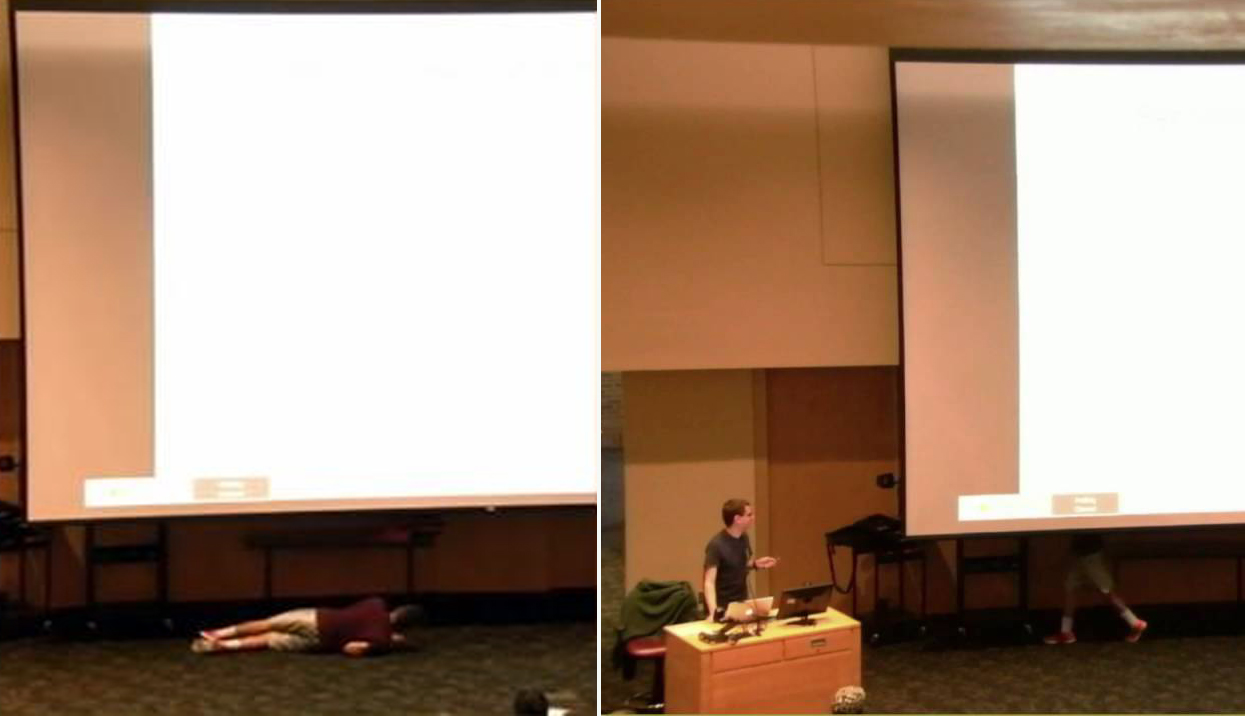 Sinh viên đang nằm trên sàn nhà và rồi đứng dậy bước ra ngoài cửa trước sự sửng sốt của giáo sư. (Youtube)