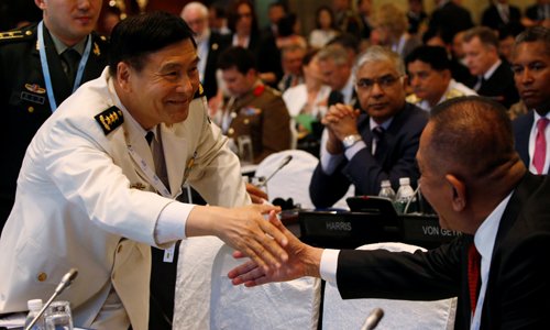 Đô đốc Tôn Kiến Quốc bắt tay với một đại biểu dự Đối thoại Shangri-La. Ảnh: Reuters