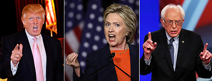 Từ bên trái là ông Donald Trump, bà Hillary Clinton, và ông Bernie Sanders. Trong ngày thứ Ba, người California sẽ tham gia bầu cử sơ bộ và sẽ chọn ứng cử viên tổng thống, cũng như bỏ phiếu cho một số chức vụ khác ở cấp tiểu bang và địa phương. (Hình: Getty Images)
