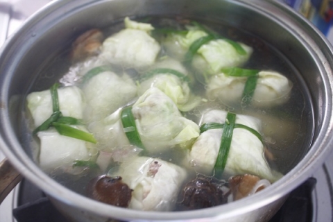 - Bạn cho các bắp cải vào nước dùng và nêm gia vị vừa ăn. Bạn nấu canh bắp cải cuốn thịt heo trong vòng 20 phút là chín sau đó dùng như một món canh.