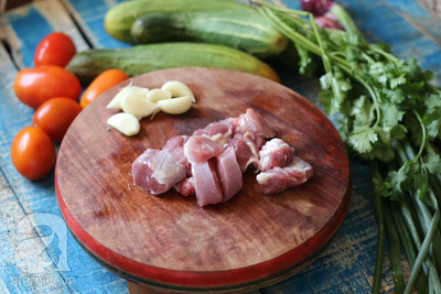 Bắp bò thái lát mỏng 3-4cm ( ể khi nấu thịt sẽ mau mềm). Cà chua thái múi cau, dưa leo cắt làm tư bỏ ruột và cắt xéo.
