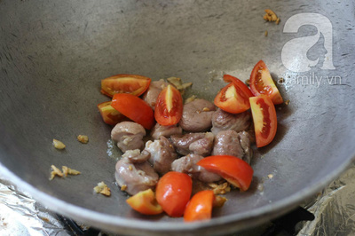 Bắc nồi lên bếp, thêm 1 muỗng dầu để phi thơm tỏi sau đó trút phần bắp bò vào xào trong 15 phút tiếp đến là cà chua thái.