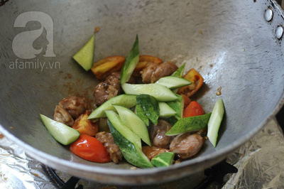 Khi bắp bò và cà chua đã mềm thì cho dưa leo vào xào chung.