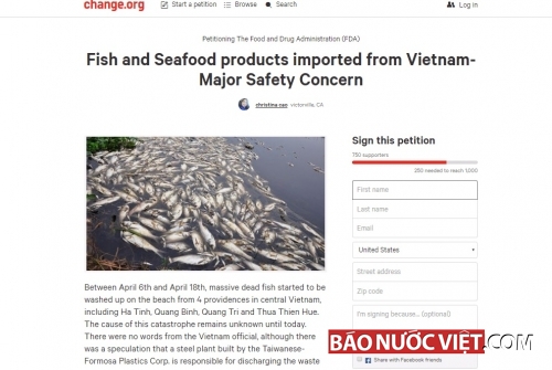Ba người Mỹ gốc Việt đă soạn một thỉnh nguyện thư đưa lên mạng xin chữ kư của người Việt cũng như người Mỹ, nhằm yêu cầu Cơ Quan Thực Dược Phẩm FDA của Hoa Kỳ kiểm nghiệm hải sản từ Việt Nam.