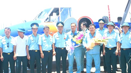 Đồng đội chúc mừng đại tá Lê Kiêm Toàn và thượng tá Nguyễn Đức Hảo (hai người cầm hoa) trở về đơn vị sau khi thực hiện nhiệm vụ bay chuyển sân hạ cánh ở Trường Sa trên một chiếc Casa-212, đầu tháng 6/2016.