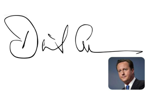 Chữ ký của Thủ tướng Anh David Cameron thì không cho thấy sự quyết liệt, theo chuyên gia Quigley. Bà tin rằng chữ ký cho thấy ông Cameron thực sự quan tâm đến ý kiến mọi người, muốn làm mọi người hài lòng.