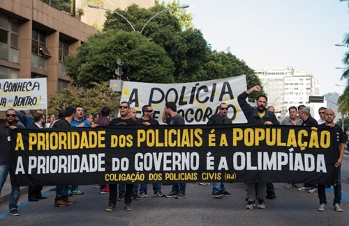 Khoảng 300 cảnh sát mặc áo đen đứng phía ngoài tòa nhà lập pháp bang Rio de Janeiro để phản đối cái họ gọi là sự bỏ rơi trước thềm Olympic, bắt đầu từ ngày 5/8. "Ưu tiên của cảnh sát là người dân, ưu tiên của chính phủ là Olympic", một biểu ngữ viết.