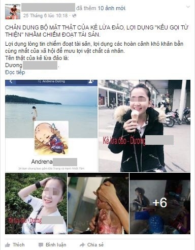 VBF-Lợi dụng mạng xã hội cô gái này đã đưa lên những hình ảnh đáng thương của các mảnh đời éo le để qua đó kêu gọi mọi người ủng hộ. Tuy nhiên khi có tiền cô giá này đã không chuyển cho người nghèo mà dùng số tiền đó để ăn chơi du lịch.Mới đây, trên trang cá nhân của mình, anh Nguyễn Thành Trung (hội trưởng Hội từ thiện Hạnh phúc là Sẻ chia) thẳng thắn chia sẻ thông tin về trường hợp: một cô gái tên là B.Y (Sài Gòn) đã lợi dụng công việc từ thiện để thu lợi bất chính, phục vụ mục đích ăn chơi, làm đẹp của mình.