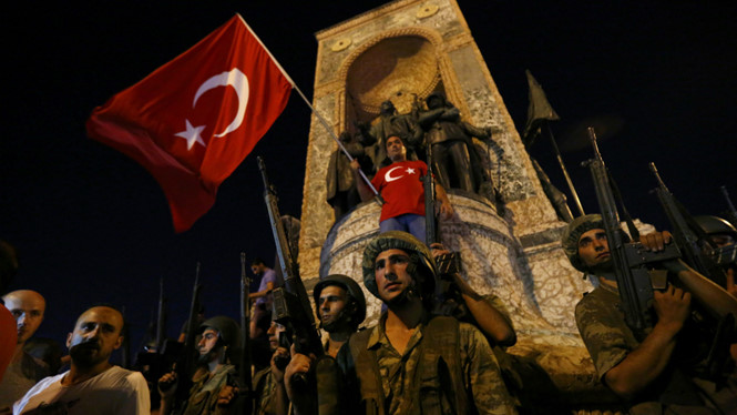 Quân đội Thổ Nhĩ Kỳ đứng gác ở quảng trường Taksim tại Istanbul. Âm mưu đảo chính Quân sự ở Thổ Nhĩ Kỳ đã thất bại sau khi người dân đáp lời kêu gọi của Tổng thống nước này Tayyip Erdogan, xuống đường ủng hộ ông, ngăn chặn phe đảo chính. Reuters