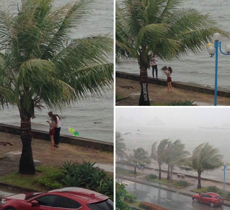Cơn bão số 1 tạm thời đã lắng xuống và nhiều người vẫn chưa hoàn hồn. Cây đổ ngổn ngang và gió rít kinh hoàng. Cặp đôi này vẫn thoải mái thể hiện tình yêu thắm thiết ngay sát bãi biển mặc dù trời đang mưa to, gió lớn.