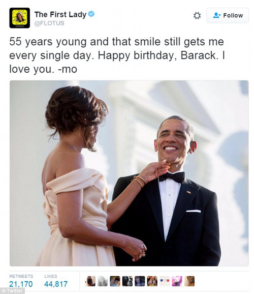 Trên trang Twitter, Đệ nhất phu nhân Mỹ Michelle Obama khoe bức ảnh tình cảm bên chồng tại một bữa tiệc mùa xuân năm ngoái. Đi cùng với đó là lời chúc mừng sinh nhật giản dị nhưng ngọt ngào khiến dân mạng tan chảy. “Mừng tuổi 55 trẻ trung, và nụ cười này vẫn sẽ khuất phục em mỗi ngày. Sinh nhật vui vẻ, Barack. Em yêu anh”, bà Obama viết. Cuối dòng chia sẻ, bà đề chữ “-mo” là một thông điệp riêng của hai vợ chồng.