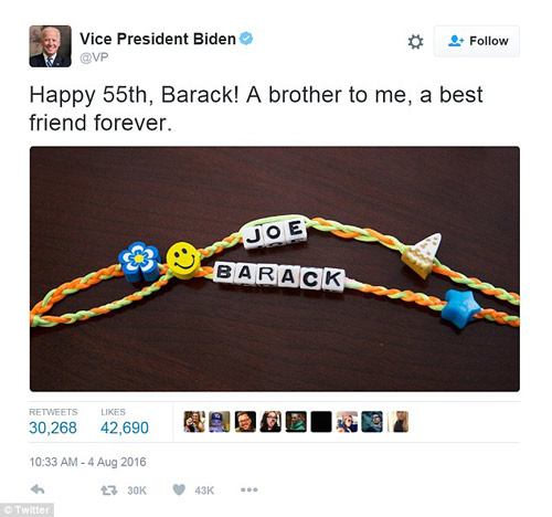 Phó Tổng thống Joe Biden đăng trên tài khoản mạng xã hội Twittter cá nhân hình ảnh chiếc vòng đeo tay gắn hạt cườm khắc chữ Joe và Barack được chính tay Tổng thống Obama làm cho hai người mùa hè trước. Ông Joe không quên gửi lời chúc mừng Tổng thống dưới bức ảnh: “Mừng tuổi 55, Barack! Người anh em của tôi, bạn tốt mãi mãi của tôi”.
