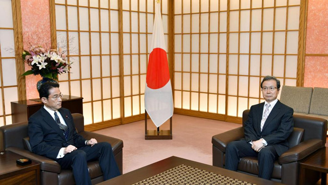 Ngoại trưởng Nhật Bản Fumio Kishida (trái) ngày 9/8 đã triệu đại sứ Trung Quốc Trình Vĩnh Hoa để phản đối vụ đưa tàu xâm nhập vùng biển Nhật Bản