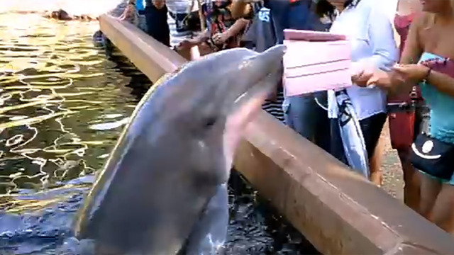Trong khi tham quan hồ nước tại công viên SeaWorld ở Florida, Mỹ, một nữ du khách dùng iPad của mình để chụp ảnh. Vị khách này không khỏi hết hồn khi một chú cá heo bỗng trồi lên mặt nước, ngay cạnh cô và nhẹ nhàng lấy đi chiếc iPad.