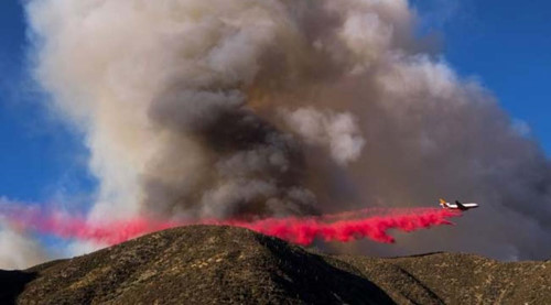 Máy bay cứu hỏa đang cố dập tắt đám cháy tại thung lũng Lytle, bang California AFP