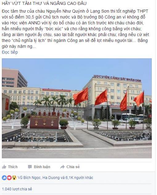 Trong đó, Như Quỳnh (đạt 30,5 điểm, nguyện vọng thi vào Học viện An ninh Nhân dân) đã viết đơn cầu xét gửi Chủ tịch nước và Bộ trưởng Công an. Một nữ sinh khác ở Lạng Sơn là Tô Thị Đệ (20 tuổi, xã Tú Đoạn, Lộc Bình) đạt 30 điểm nhưng không đủ điều kiện chính trị đỗ Học viện Cảnh sát Nhân dân, đã gửi tâm thư tới Bộ trưởng Công an và Tổng cục trưởng Tổng cục Chính trị, Bộ Công an.