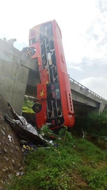 Tại hiện trường, chiếc xe khách treo lơ lửng trên thành cầu, đầu xe cắm thẳng xuống đất.