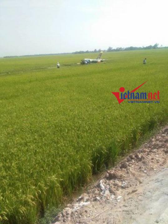 Máy bay quân sự loại nhỏ, rơi ngay trên ruộng lúa, một số bộ phận bị rời ra nhưng thân máy bay vẫn c̣n nguyên vẹn.