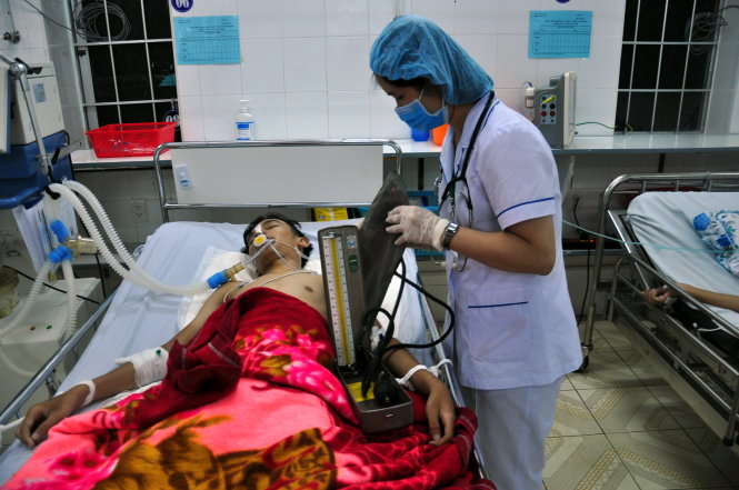 Lúc 21g30, bác sĩ Lê Quốc Bàn - trực Khoa hồi sức tích cực Bệnh viện Lê Lợi - cho biết bệnh nhân tiên lượng nặng dù huyết áp ổn, đồng tử co nhỏ.