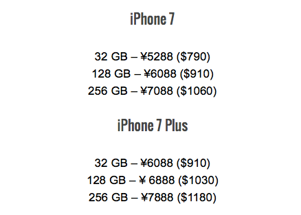 Trước thời điểm ra mắt khoảng một tuần, bảng giá của bộ đôi iPhone mới đã xuất hiện tại Trung Quốc. Theo đó, iPhone 7 sẽ có giá khởi điểm từ 5.288 tệ (khoảng 790 USD) trong khi giá của iPhone 7 Plus là từ 6.088 tệ (910 USD). Đây đều là giá dành cho bản 32 GB. Các phiên bản kế tiếp có dung lượng lần lượt 128 và 256 GB. Như vậy, Apple sẽ khai tử iPhone 64 GB, giống với cách họ loại bỏ bản 32 GB trước đây.