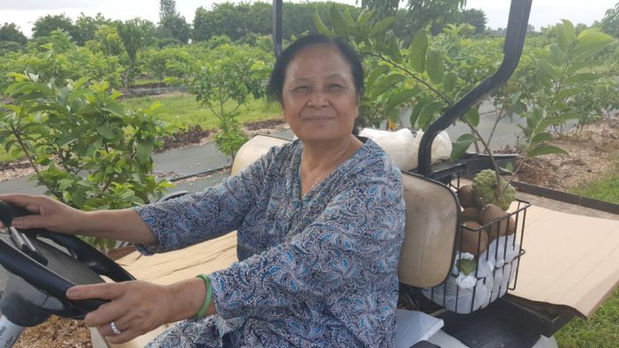 Cô Chín Nguyệt, chủ nhân vườn trái cây Chín Nguyệt ở Homestead (Hình: Ngọc Lan/Người Việt)