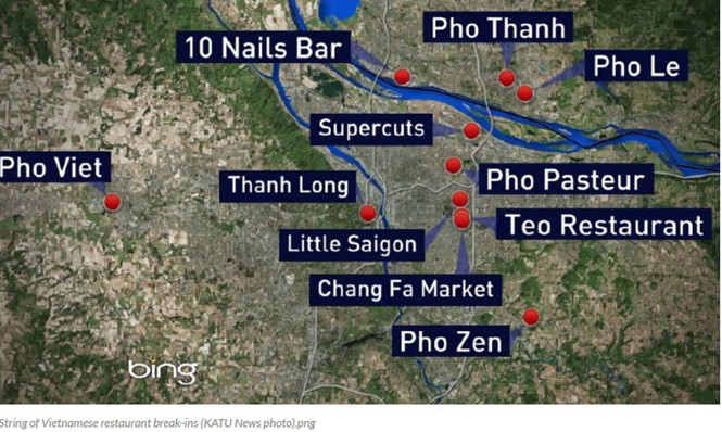 Theo kênh KATU-2, thông tin từ cảnh sát cho biết chỉ trong 2 tuần qua, có ít nhất 12 vụ trộm xảy ra ở các nhà hàng Việt tại Mỹ. Chỉ riêng thành phố Portland, bang Oregon, cảnh sát đang điều tra 6 vụ trộm vừa diễn ra. Trong hầu hết các vụ trộm, kẻ trộm đã “cuỗm” toàn bộ tiền mặt bên trong các cửa hàng.
