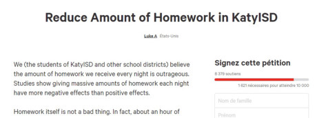 “Chúng tôi (là học sinh ở Khu học chánh độc lập Katy và ở các khu học chánh khác) tin rằng lượng bài tập về nhà chúng tôi phải làm mỗi tối đã bị quá tải. Các nghiên cứu cho thấy khi cho học sinh quá nhiều bài tập về nhà mỗi đêm sẽ gây ra các ảnh hưởng mang tính tiêu cực hơn là tích cực”.