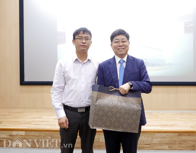 Ông Nguyễn Văn Hoài – Phó Tổng biên tập báo Nông Thôn Ngày Nay đại diện đoàn công tác tặng quà cho ông Oh Sung Jong - Viện trưởng Viện Khoa học Chăn nuôi quốc gia Hàn Quốc