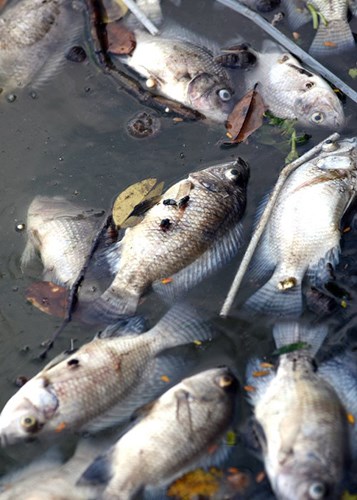 Cá chết khiến ruồi nhặng bâu kín và đang trong tình trạng phân hủy.