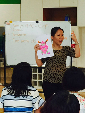 30 phút sau, Mai tập cho các em cách làm thủ công. Chủ đề rất đa dạng tùy thuộc vào lứa tuổi. Ví dụ, Mai tập cho học sinh lớp 2 và 3 tuổi làm cây dù bằng đĩa giấy. Các em lớp lớn hơn sẽ học cách trang trí, cắt dán khung hình cho ảnh gia đình. Để bắt đầu một tiết dạy, Mai thường tập cho học sinh hát bài “Are you ready?”, dịch là “Các em đã sẵn sàng chưa?”. Thông qua những giai điệu và ca từ quen thuộc của bài hát, học sinh hiểu được đã đến lúc vào giờ học. Sau đó Mai cho các em đi vệ sinh rửa tay và uống nước. Các em sẽ tự lấy ghế ra và ngồi theo hình chữ U trước khi chính thức nghe giáo viên giảng bài.