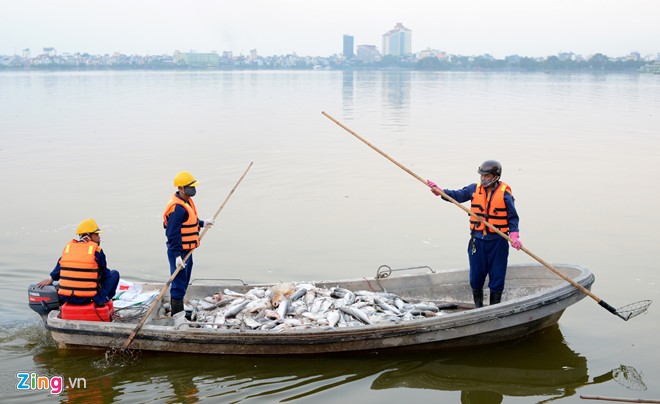 Theo đó, nhiều lực lượng thuộc Bộ Tư lệnh thủ đô, công an, cảnh sát PCCC và cứu hộ cứu nạn,… tập trung nhân lực, phương tiện vớt cá chết đưa đến bãi rác Nam Sơn chôn xử lý.