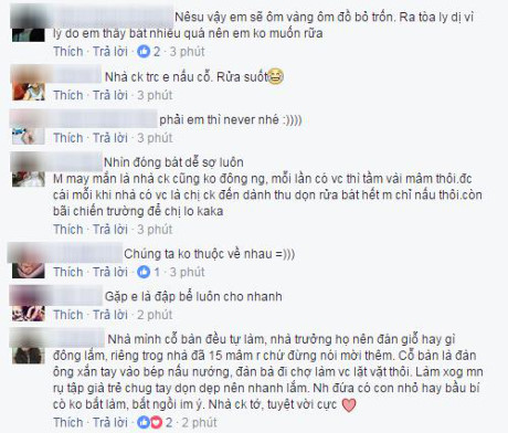 Nghiêm túc hơn là các bà vợ đã từng có kinh nghiệm làm dâu đầy mình, họ chia sẻ đủ chuyện trên trời dưới bể liên quan đến từ khóa “rửa bát”, góp vui cho chị em bàn tán thêm sôi nổi. Thì ra, đống bát hãi hùng như quân Nguyên kia vẫn chưa thấm vào đâu so với nhiều người, bởi các nàng dâu mới vĩ đại từng phải xử lý số lượng nồi niêu bát đũa bẩn còn kinh khủng hơn gấp nhiều lần. Nhất là ở các vùng quê, chuyện ngồi bờ ao hay bờ giếng với hàng chục mâm bát xung quanh vốn là chuyện quá bình thường.