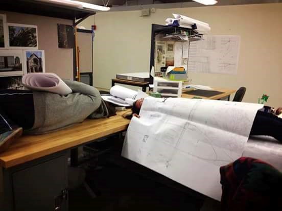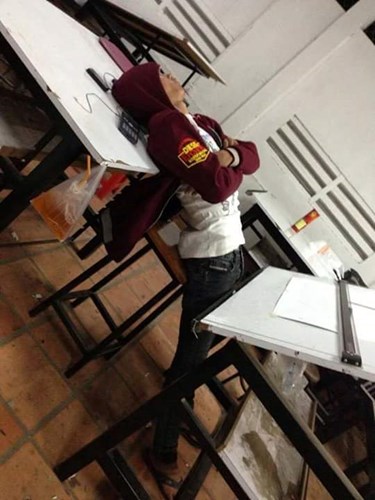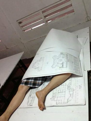 Do dành hết tâm trí cho các bản vẽ, bản thiết kế, nhiều sinh viên, kiến trúc sư thường xuyên phải ngủ ngay trên bàn làm việc. Lấy bảng, thước làm đệm, lấy giấy, bản vẽ làm chăn đắp... Dù với người bình thường cách ngủ này sẽ khiến họ cảm thấy vô cùng mệt mỏi nhưng với những người còn đang điên đầu vì các deadline, giấc ngủ chớp nhoáng trong vòng 10-20 phút ở mọi tư thế cũng là một điều vô cùng quý giá.