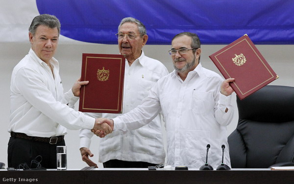 Tổng thống Santos và Rodrigo London, biệt danh Timoleon "Timochenko" Jimenez, đứng đầu Lực lượng vũ trang Cách mạng Colombia (FARC), ngày 26/9 ký thỏa thuận hòa bình, chấm dứt 52 năm nội chiến. Tuy nhiên, người dân Colombia, trong cuộc trưng cầu dân ý ngày 2/10, lại phản đối thỏa thuận này.