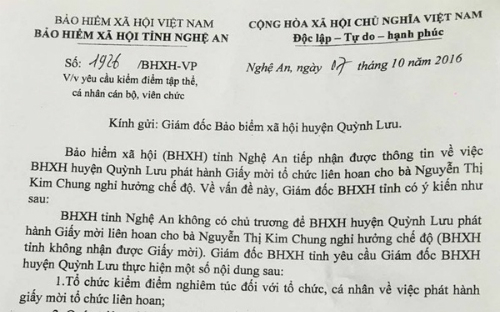 Ngày 6/10, ở Nghệ An xuất hiện giấy mời các lãnh đạo tỉnh, huyện đến liên hoan chia tay bà Nguyễn Thị Kim Chung - Giám đốc Bảo hiểm xã hội huyện Quỳnh Lưu về hưu. Trên giấy mời có đóng dấu đỏ và chữ ký của ông Đặng Ngọc Thọ, Phó giám đốc Bảo hiểm xã hội. Sự việc đang gây xôn xao và bất bình trong dư luận.