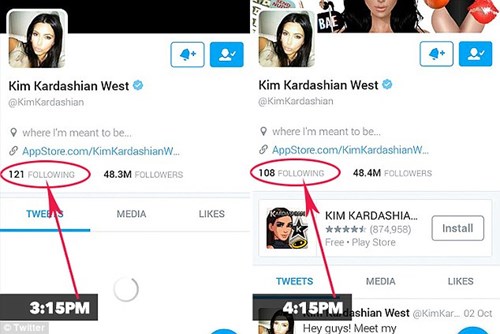Bên cạnh đó, Kim cũng vừa trở lại mạng xã hội vào hôm 12/10. Trang The Sun phát hiện, ngôi sao đã nhấn hủy theo dõi 13 người trên Twitter.