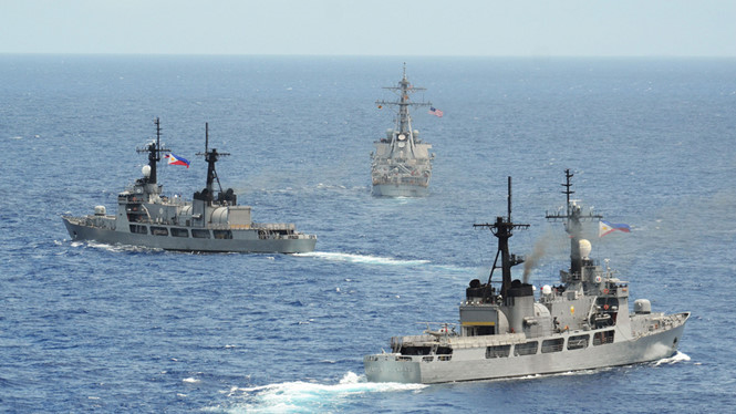 Hai chiến hạm Gregorio del Pilar và Ramon Alcaraz của Philippines (đều là tàu cũ do Tuần duyên Mỹ viện trợ) tập trận chung với khu trục hạm Mỹ John S. McCain trên Biển Đông ngày 28.6.2014 Hải quân Mỹ